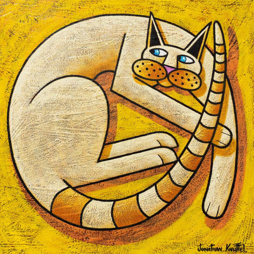 Employing what one might describe as a version of surrealism – Knuttel appears to be challenging the perceptions of reality through the use of exaggerated caricature styles, fun compositions and vivid colours. His original pieces, are distinctive, bright and uplifting.