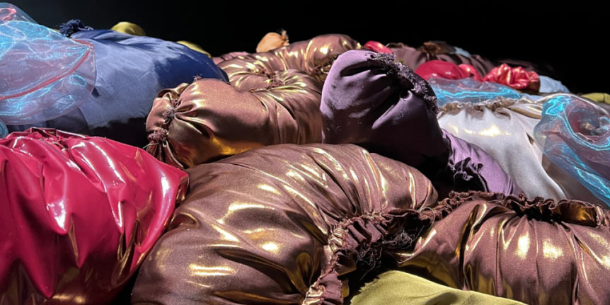 The installation invites viewers to engage with the textile sculpture, as soft, airy fabrics gently brush against your skin, encouraging tactile exploration through hand-sewn strands.