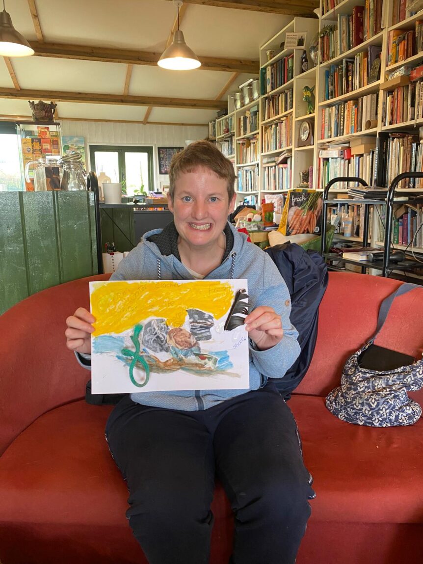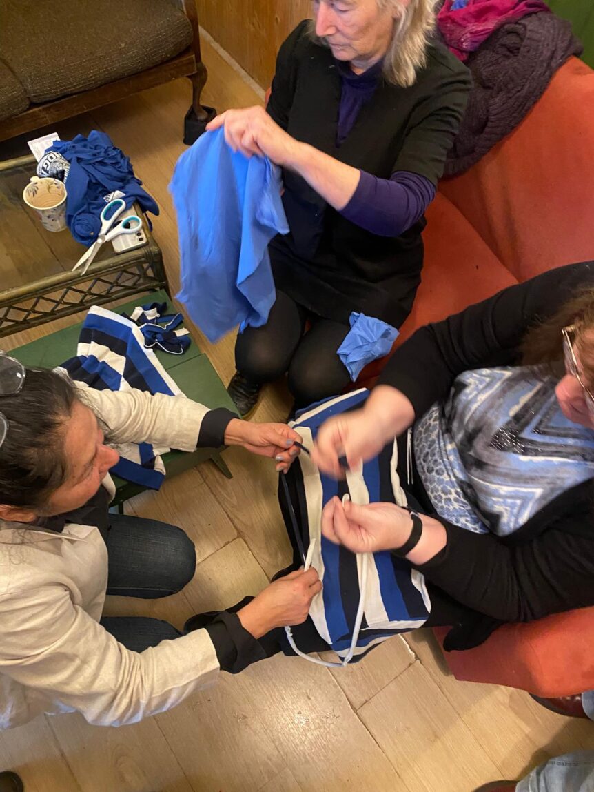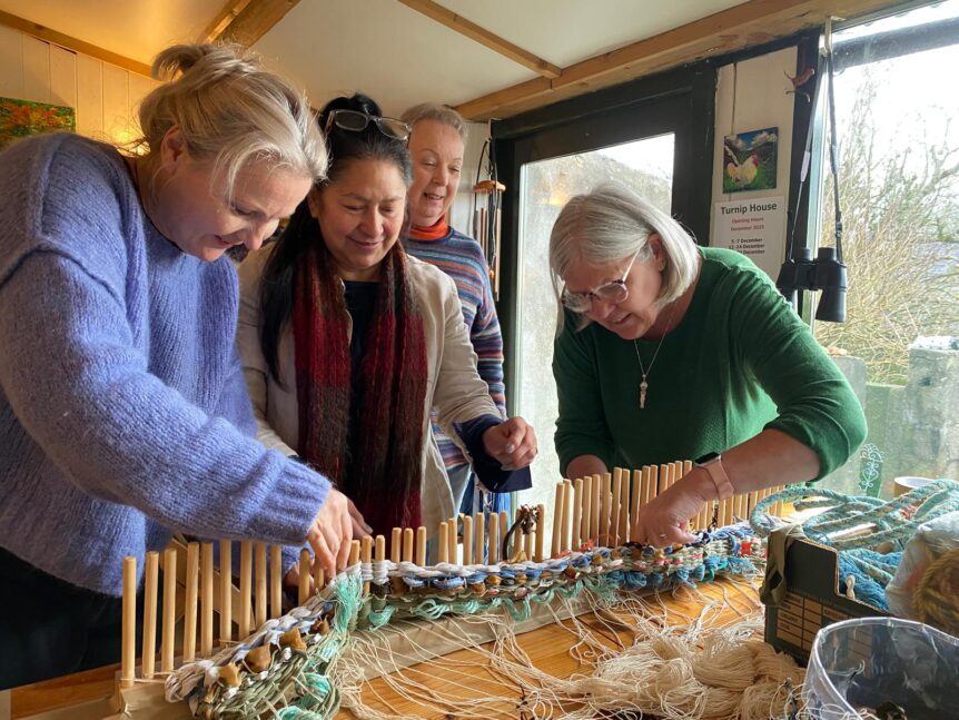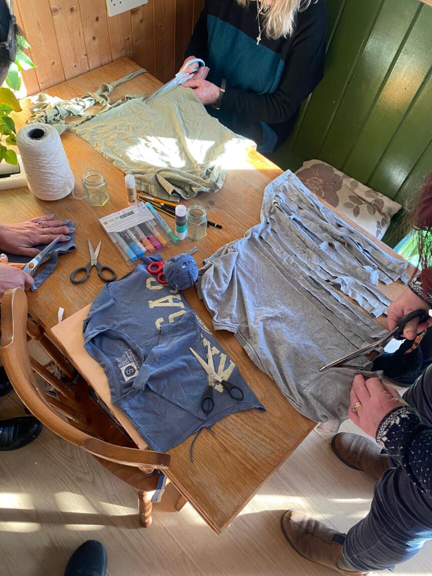 Interwoven Dolmens Climate action group in Castlewellan started their workshops by firing ideas across and the main ones that stood out was environment, our oceans, and recycling. We started creating some ideas boards and learning how to turn an old t-shirt into one continuous length of yarn. it was decided to weave a St Brigid’s cloak for an up coming event. Everyone spent time beach combing, litter picking and collecting items to weave with. The next 2 workshops was spent making a warp for a large peg loom and weaving our recycled yarn and found items from the beach. We are making great progress and everyone is very excited to be learning new techniques and meeting like minded people.