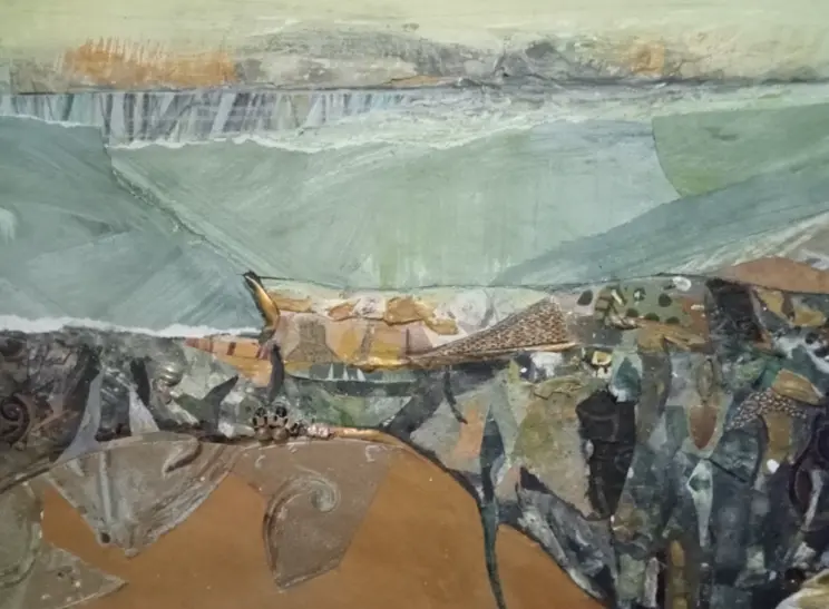 Rachael uses mixed media to create collage paintings on canvas. Creative material can include oil and water-based paints, inks, pastels and charcoal, textured & handmade paper, organic material, fabrics & natural fibres, metal, stone, wood and glass.